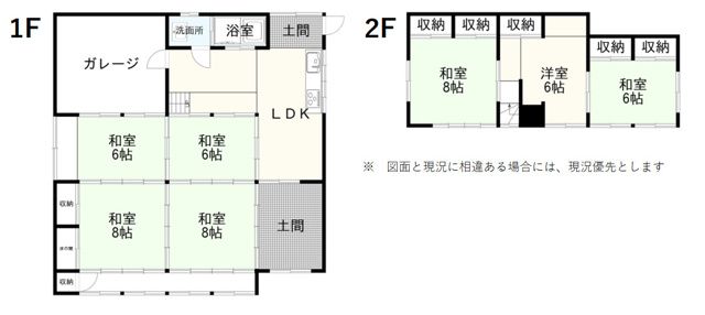 | 間取り | 7LDK | 間取り内訳 | 1階:LDK 、和室 6帖×2、和室 8帖×2、2階:和室 8帖、和室 6帖、洋室 6帖 |