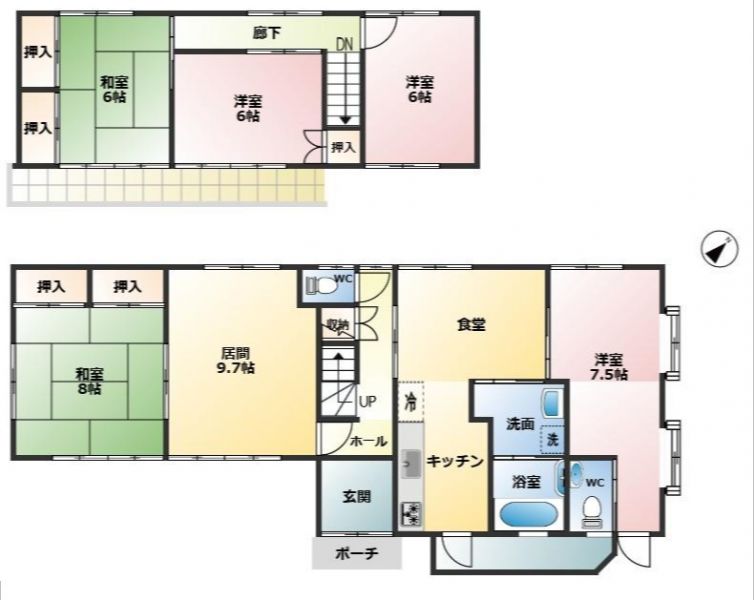 間取り | 5LDK | 間取り内訳 | 1階:L 9.7帖、DK 10.5帖、和室 8帖、洋室 7.5帖、2階: 洋室 6帖×2、和室 6帖 |